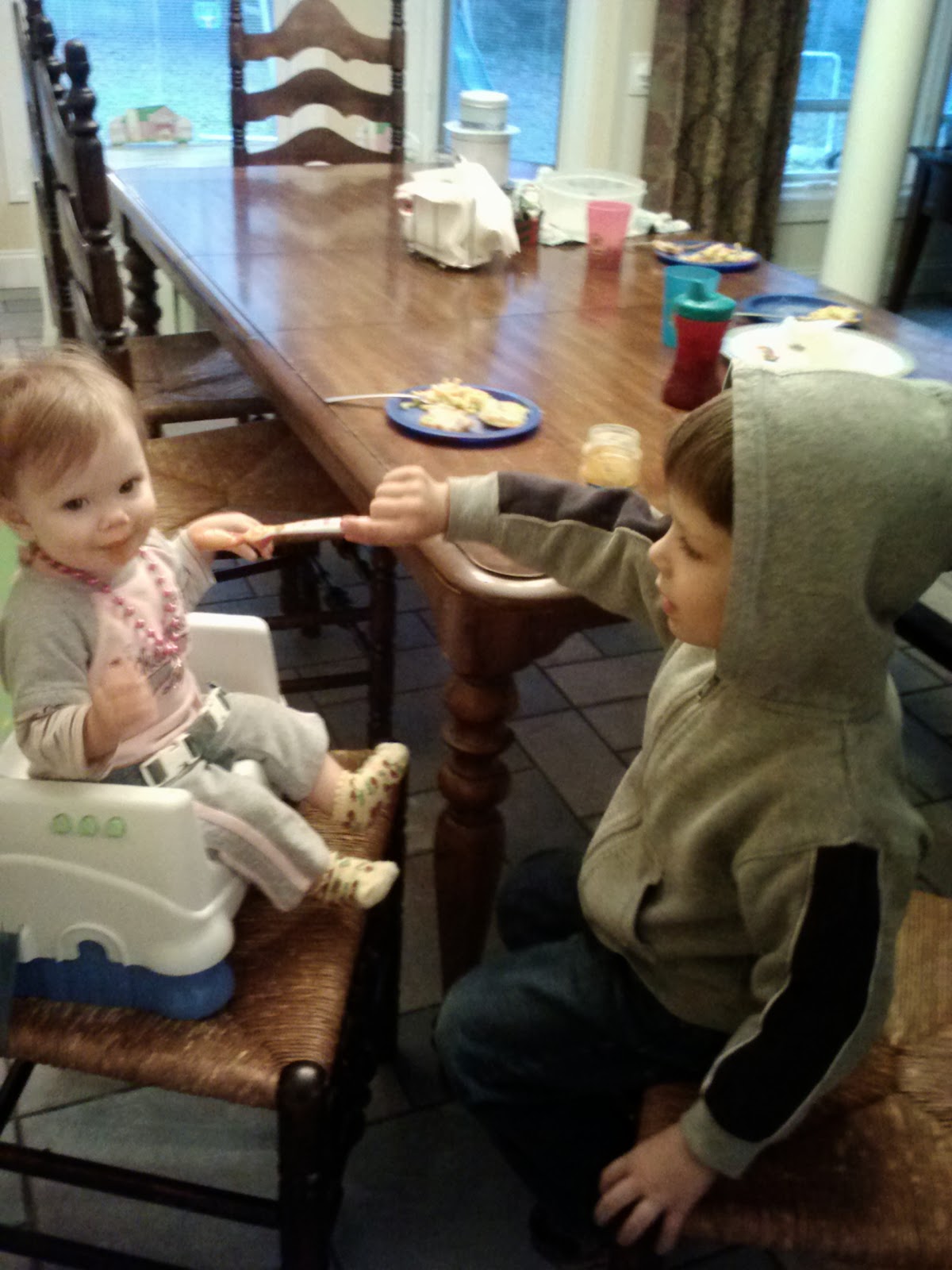 Big brothers are the best. Thankfully, David has done a 180 with his attitude towards Mary Jo. He actually tries to pick her up (which is discouraged, of course), he keeps a lookout for when she is climbing the stairs, and he shares toys with her. The other day Steven was trying to train her not to climb the stairs and he hurt her feelings over it - but it just devastated D, he was crying more than she was.